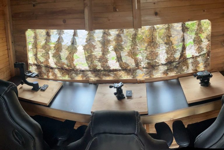 Fotograf:innen beobachten das Gelände aus einer getarnten Fotohütte (Hide)